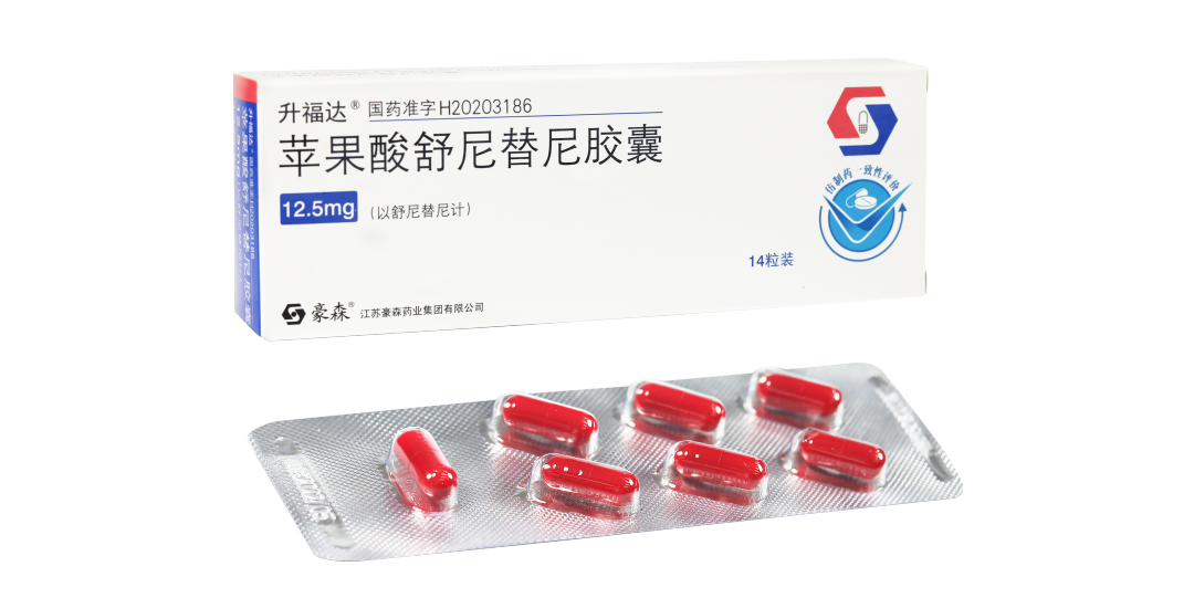 升福达®(苹果酸舒尼替尼胶囊)是一种多靶点受体酪氨酸激酶抑制剂,临床上主要用于治疗胃肠间质瘤、肾细胞癌和胰腺神经内分泌瘤成年患者。2020年5月获批上市。